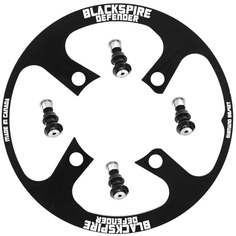 The Blackspire Defender is the first bashguard for 2x Shimano XTR M985 cranks. It is CNC milled from anodized 6061 T-6 aluminum and comes with laser etched graphics and mounting hardware. The maximum capacity is 42 teeth.