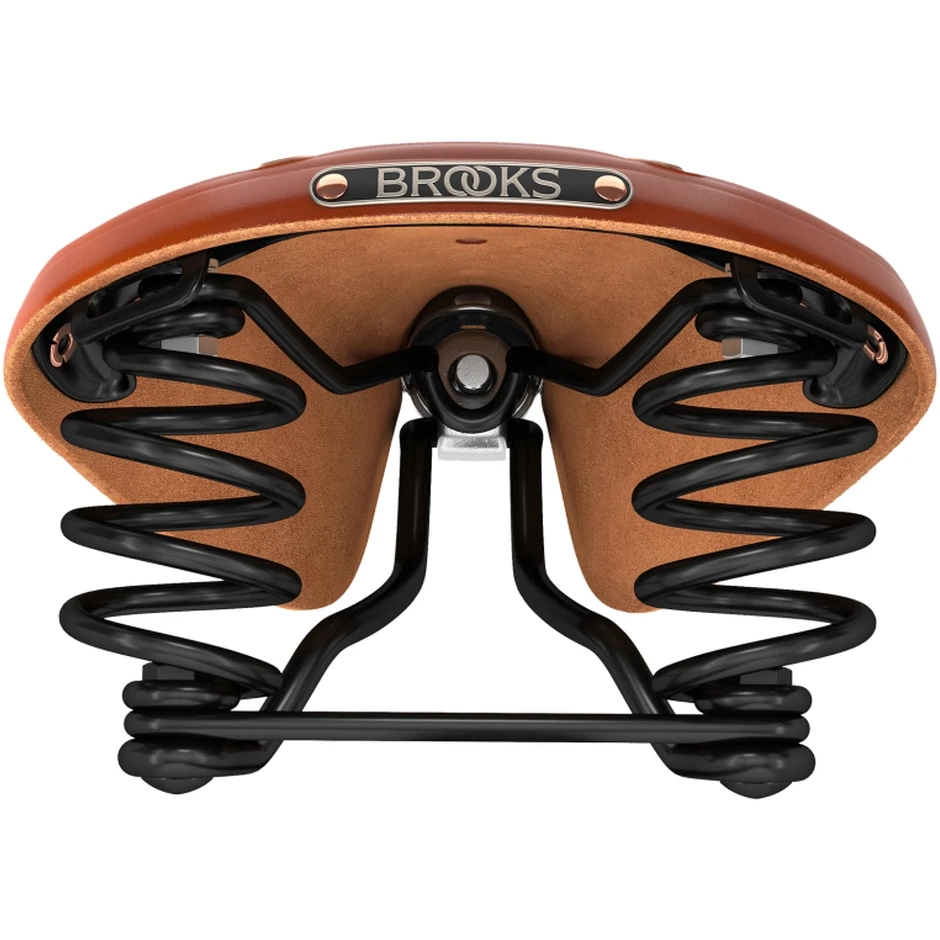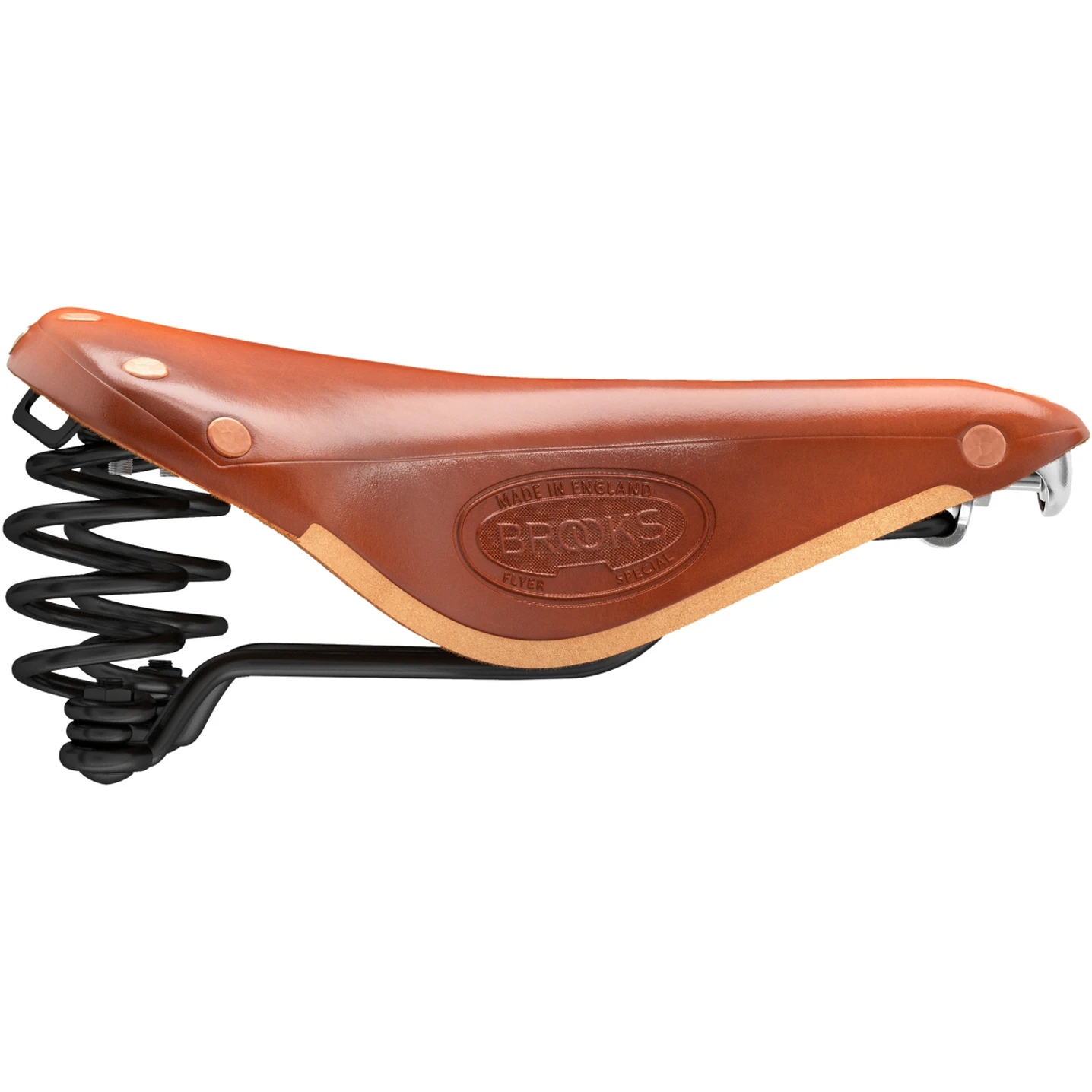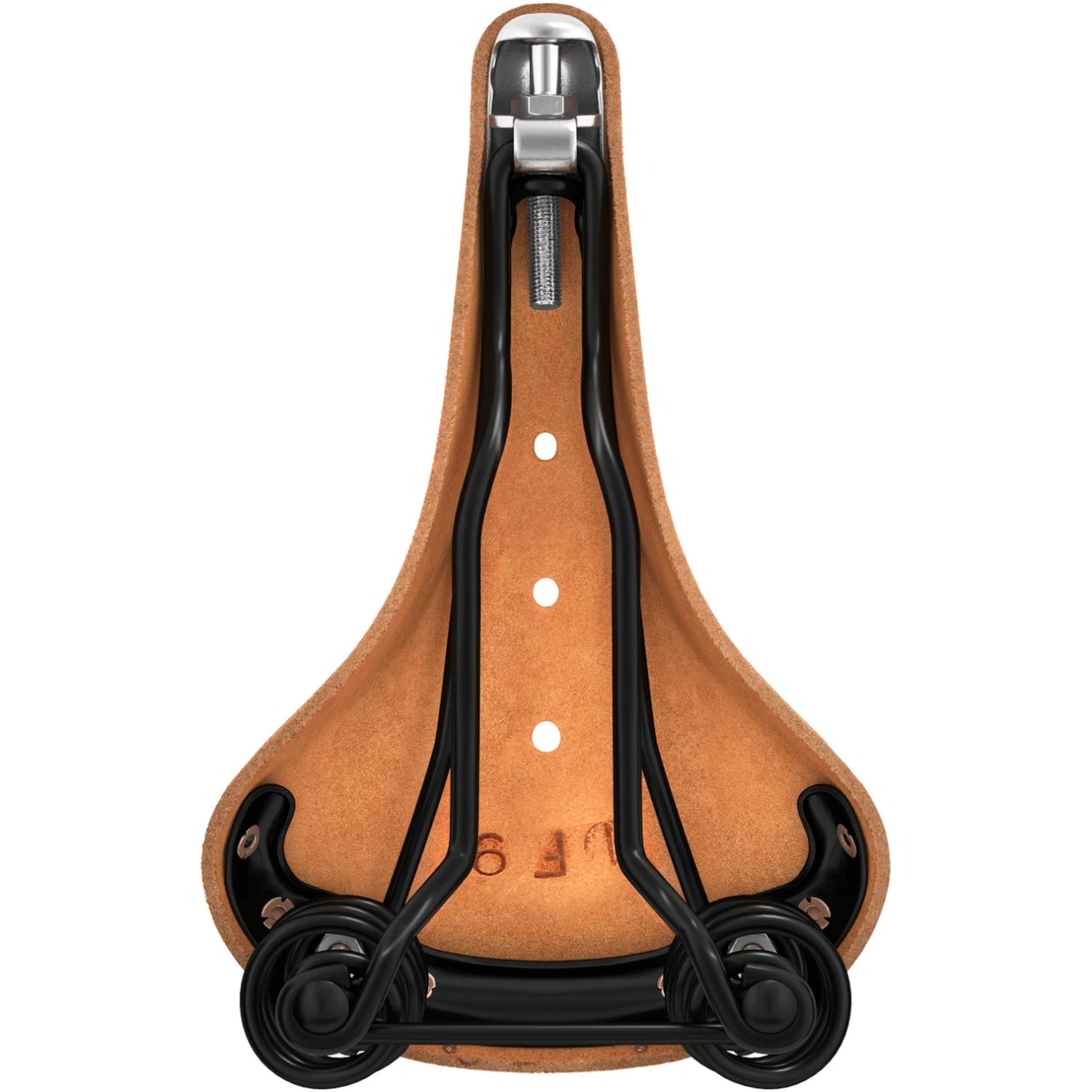 The is a touring saddle with spring suspension for comfort and hand hammered rivets for durability. It has the same leather top as the B17 model, but with added suspension and hand-hammered copper rivets that protect the leather over time. One of our most popular models, the Flyer is handmade in our Smethwick, England factory and features a durable black powder-coated frame.