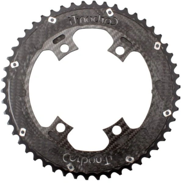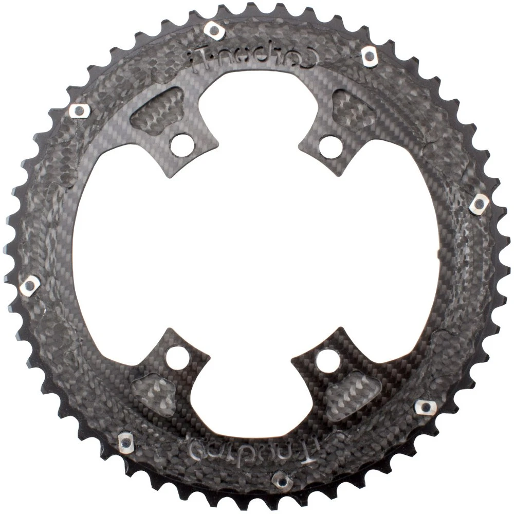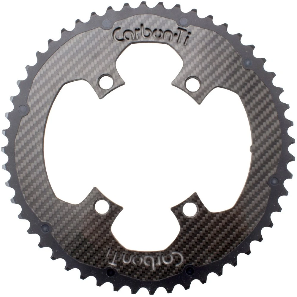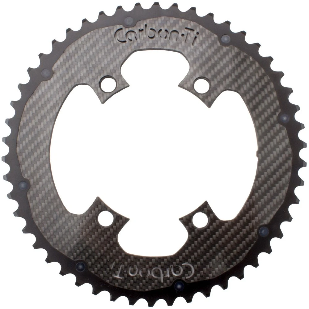 X-CarboRing is the next generation of super lightweight carbon and aluminum chainrings from Carbon-Ti. The main body is made of structural carbon fiber with titanium as well as CNC machined climbing aids and offers amazing shifting performance with mechanical or electronic derailleurs. The teeth are made of 7075-T6 aluminum, individually machined and optimized to ensure functionality in any condition.