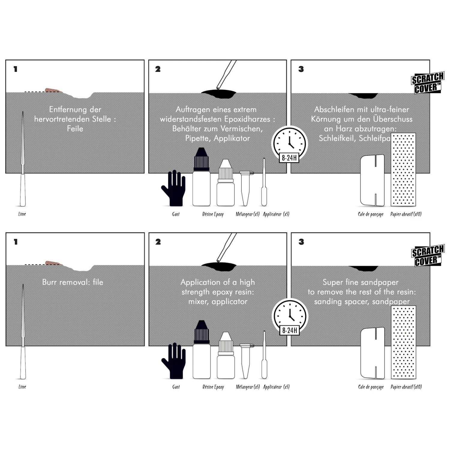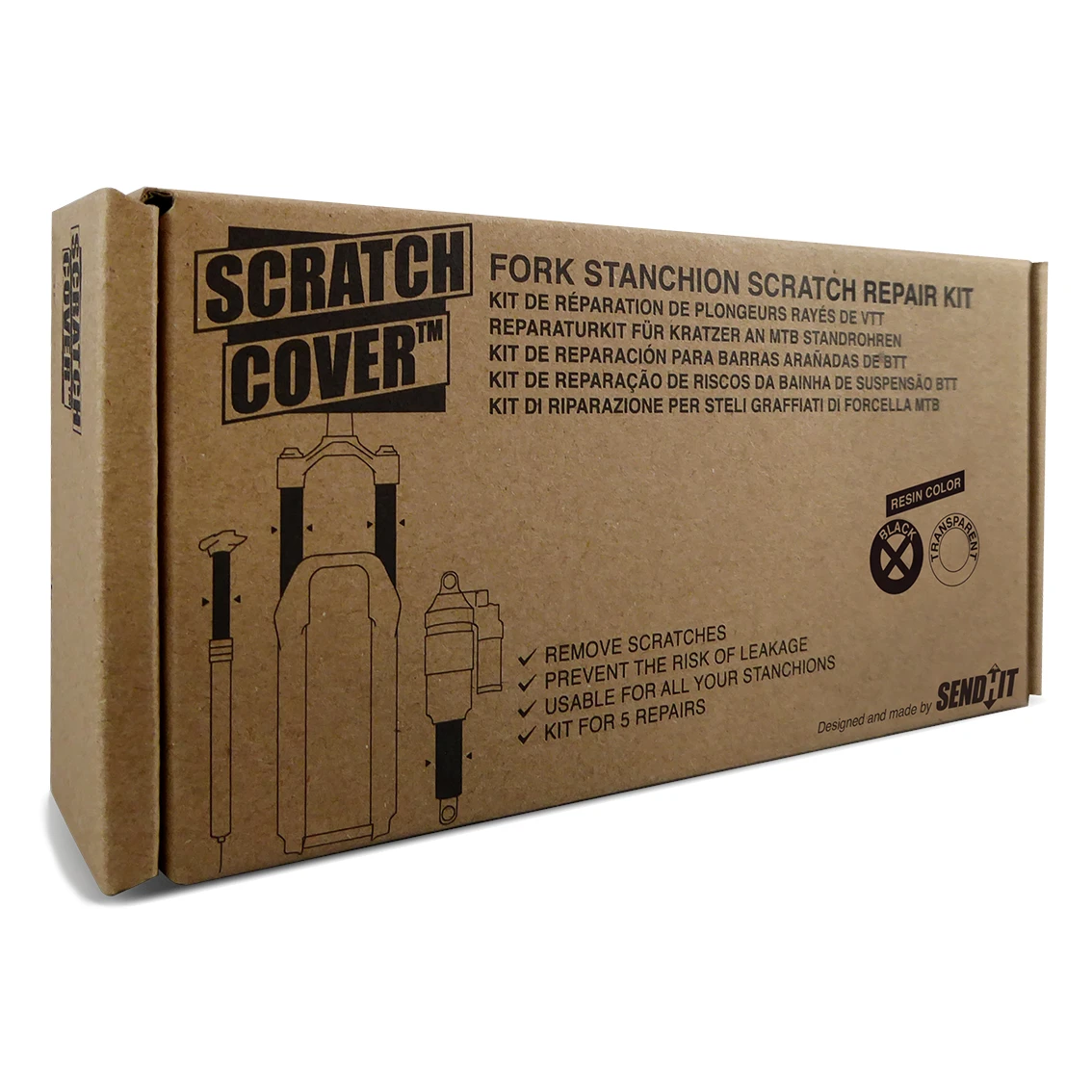 The Sendhit Scratch Cover kit includes all the accessories you need to repair your fork stanchion without any other tools, and whether you are at home or on the go. Available with black and transparent epoxy resin.