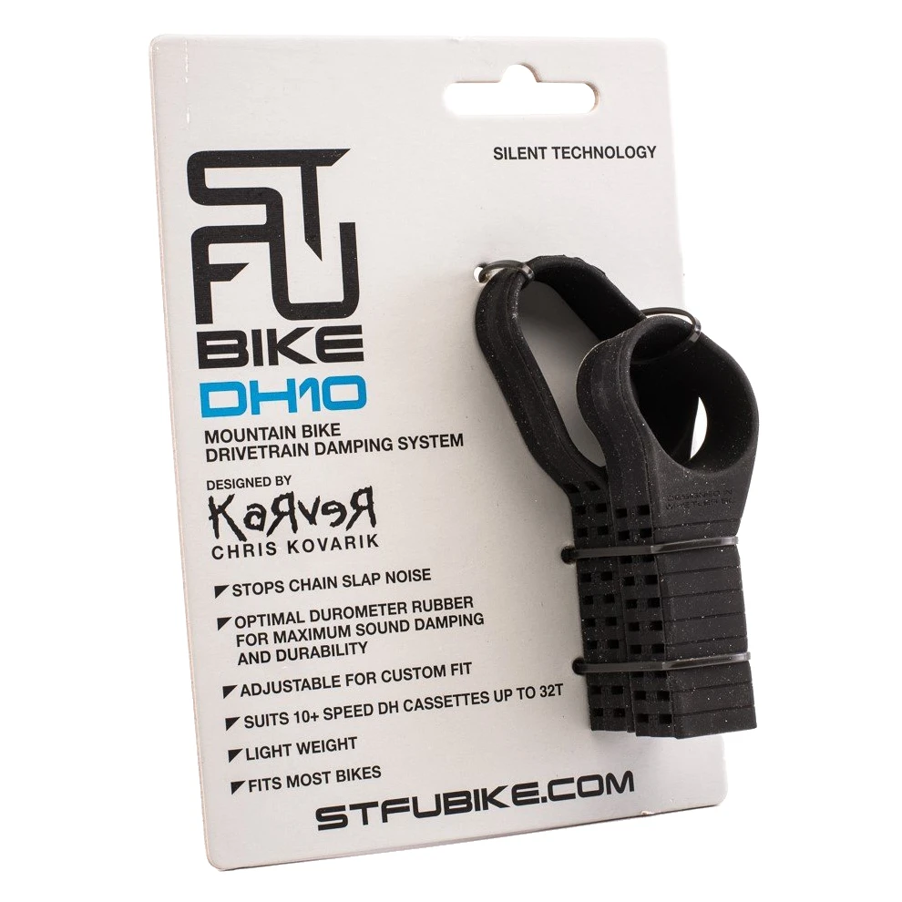 The complete range of STFU drivetrain damping devices is designed to keep your bike running quiet and efficient while minimizing wear. The STFU units contain your chain when things get rough – preventing chain slap and noise from your frame but also preventing your chain from over-extending sideways – decreasing wear and extending chain life. Under tension from pedaling the chain remains completely clear of the STFU units for complete efficiency. Thanks to their trimmable length, the modules fit the most bike’s chain stays.