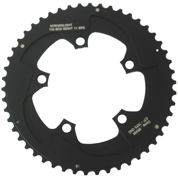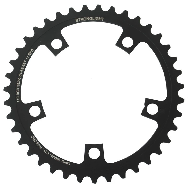 A lightweight Stronglight CT2 chain ring for road bikes. It is made of 7075-T6 aluminum with additionally added ceramic for an increased resistance and teflon coated for less friction